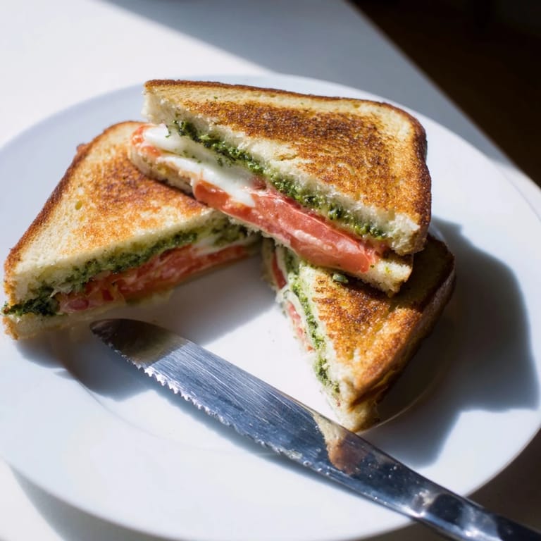 Pin It My neighbor Maria handed me a jar of her homemade pesto over the fence one Saturday morning, insisting I try it on something other than pasta. I had leftover sourdough and mozzarella in the fridge, plus a tomato sitting on the counter that needed using. What started as a lazy lunch experiment turned into something I now crave at least twice a month. The smell of toasted bread mixed with melting cheese and basil still makes me stop whatever I'm doing and just breathe it in.