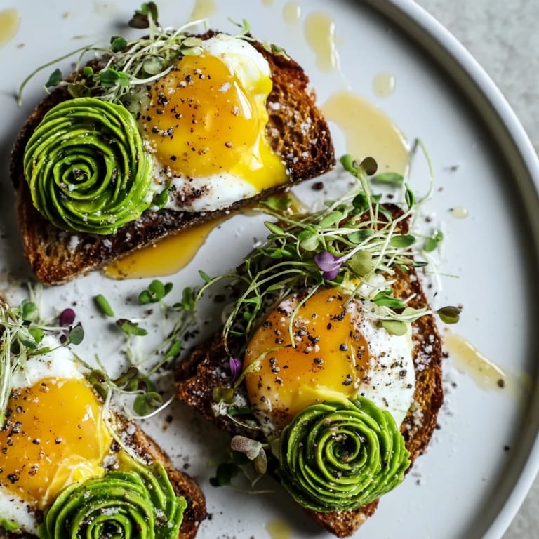 - Place each cloud egg on a slice of toast, crown it with an avocado rose, and drizzle with honey. Scatter microgreens generously over the top, then finish with a sprinkle of flaky sea salt and freshly ground black pepper. Serve immediately while the clouds are still warm.