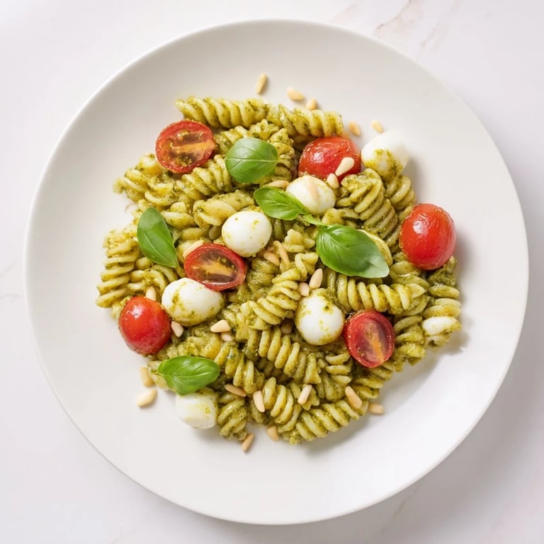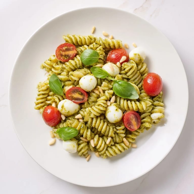 Pin It A vibrant, refreshing pasta salad featuring tender pasta, creamy mozzarella, juicy cherry tomatoes, and aromatic basil pesto—perfect for picnics or light lunches.