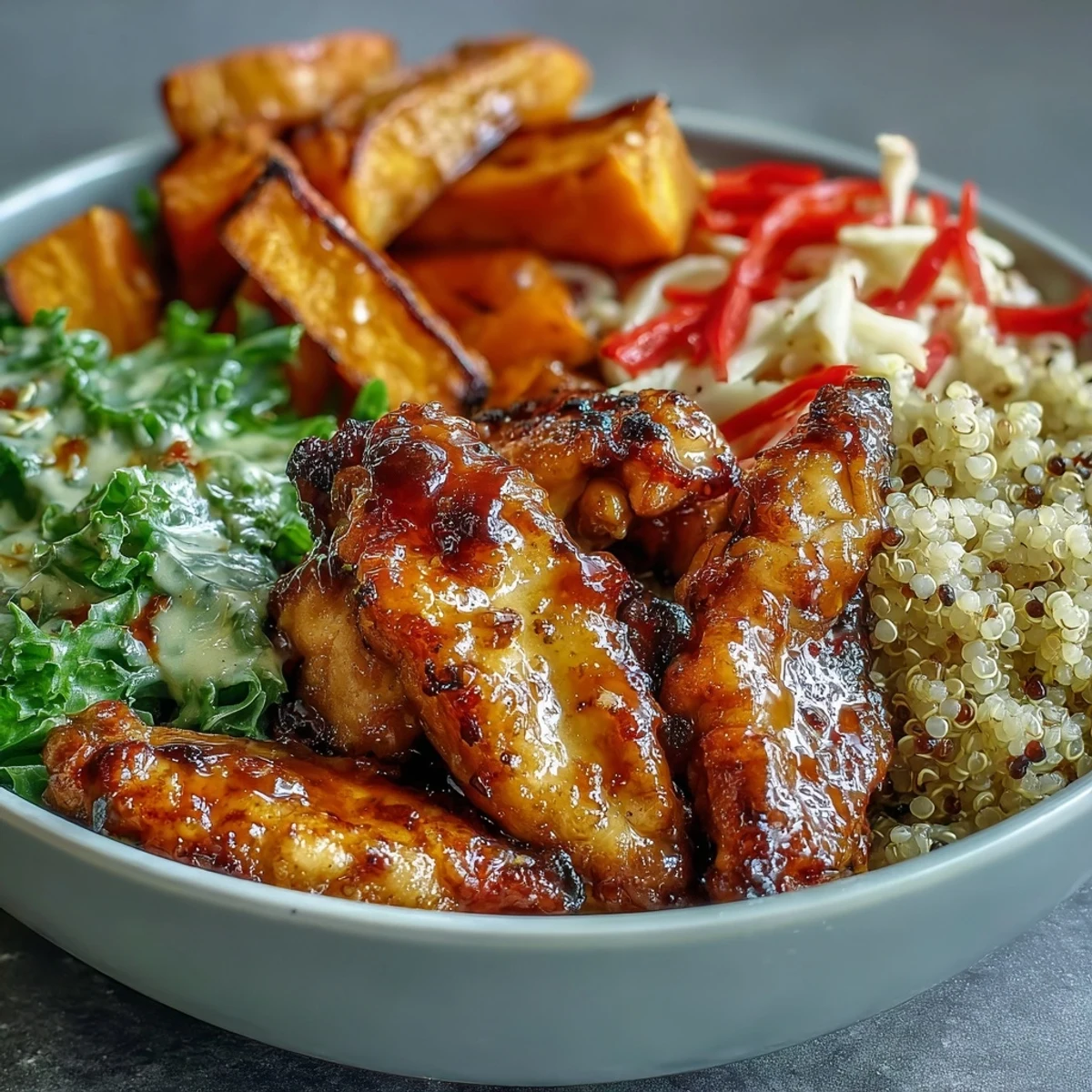 - Divide the fluffy quinoa among four bowls, then layer on the roasted sweet potatoes, cooked chicken, and marinated slaw. Drizzle generously with the hot honey mustard dressing and serve immediately while everything is still warm.