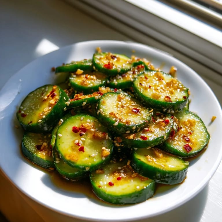 This dish lives at the intersection of immediate gratification and patience—it's ready to eat right away but actually gets better after those five to ten minutes of resting. I've tried eating it immediately and I've waited, and there's a noticeable difference in how cohesive and intentional it tastes. The cucumbers stay crisp longest at room temperature, but if you're serving at a warm meal or want that extra refreshing shock, a quick chill beforehand transforms it into something almost palate-cleansing.