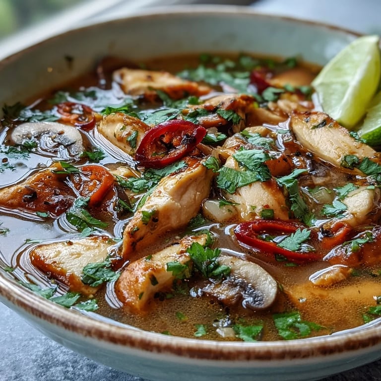 Pin It The combination of tender chicken and earthy mushrooms provides a hearty base, while the sweetness of carrots and the snap of red bell peppers add texture and color. Every spoonful is brightened by a squeeze of fresh lime juice and the savory depth of fish sauce, creating a truly authentic tasting experience.